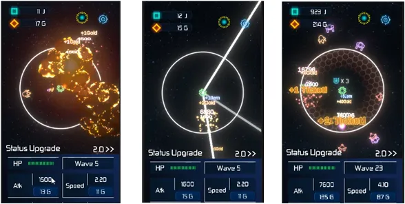 중앙에 위치한 우주선에서 기본공격 및 특수공격을 발사해 사방에서 몰려오는 적들을 물리치고, 재화를 수급해 우주선을 강화해나가는 게임입니다.
